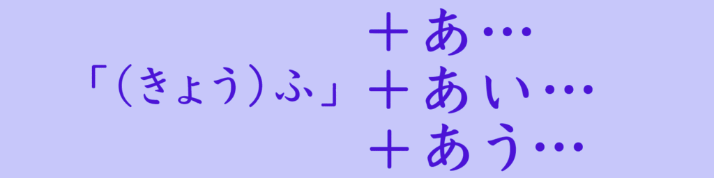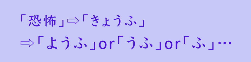 まずは『恐怖』を「きょうふ」とひらがなに変換し、「ようふ」か「うふ」か「ふ」の何文字で一致させるか(くっつけるか)を考えます。